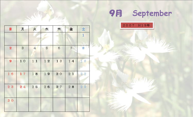 サンプル2:カレンダーの背景へデジカメ写真(8月撮影の昭和記念公園のサギソウ)を挿入して作成したもの